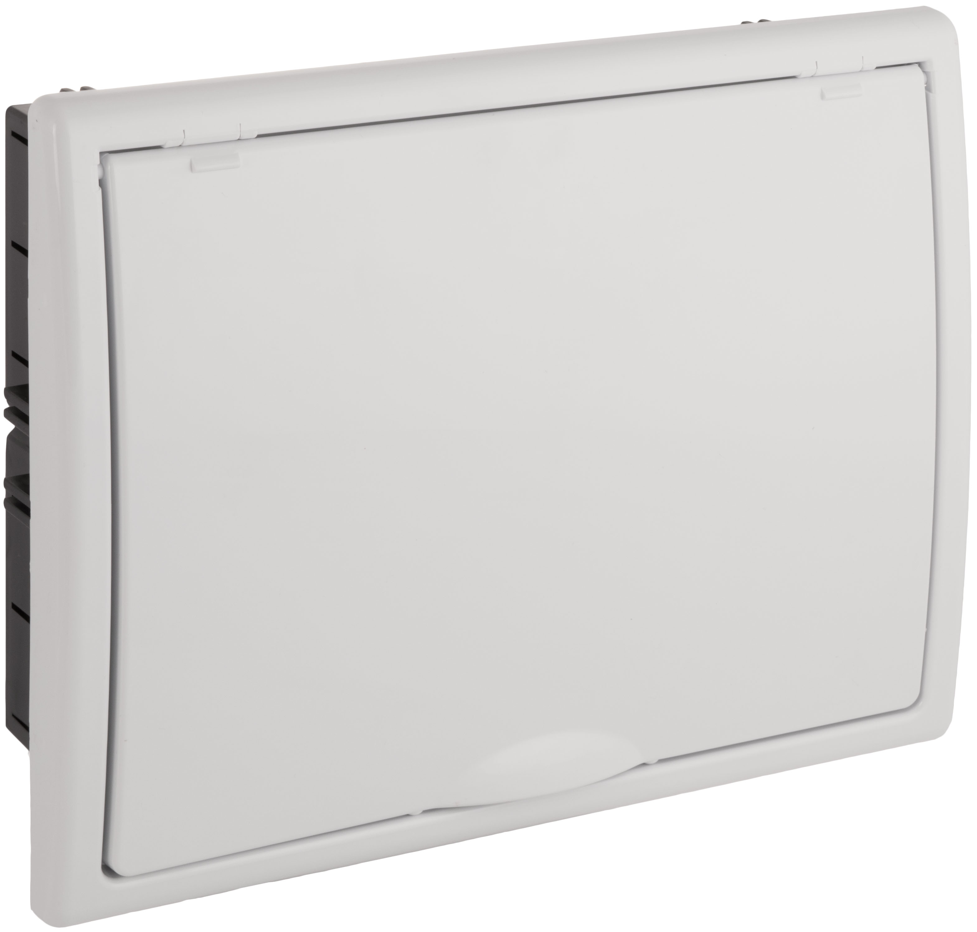 Caja de distribución de empotrar para 12 elementos. Incluye marco y puerta en color blanco. Dimensiones de empotramiento: 277 x 220 x 72 mm. Formato compacto y funcional para instalaciones modulares.